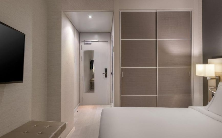 El equipamiento incluye cabeceros, mesitas de noche, escritorios, armarios y espejos, fabricados con materiales de alta calidad y acabados personalizados según las especificaciones del cliente.